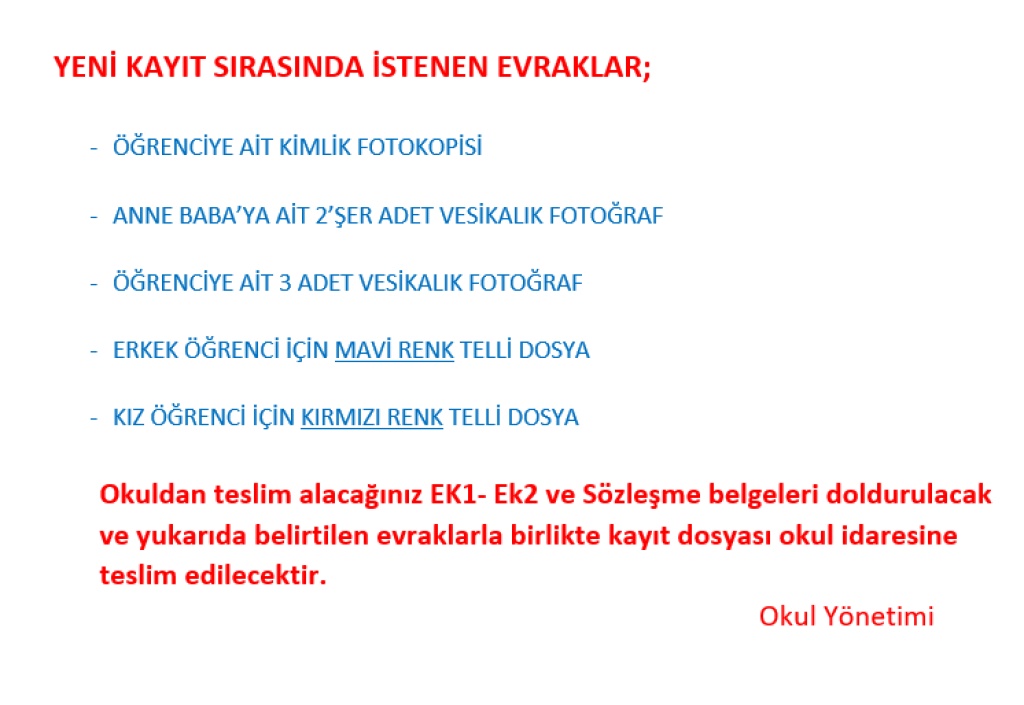 Kayıt esnasında istenen evraklar aşağıda belirtilmiştir.